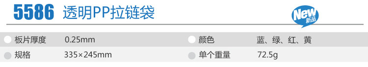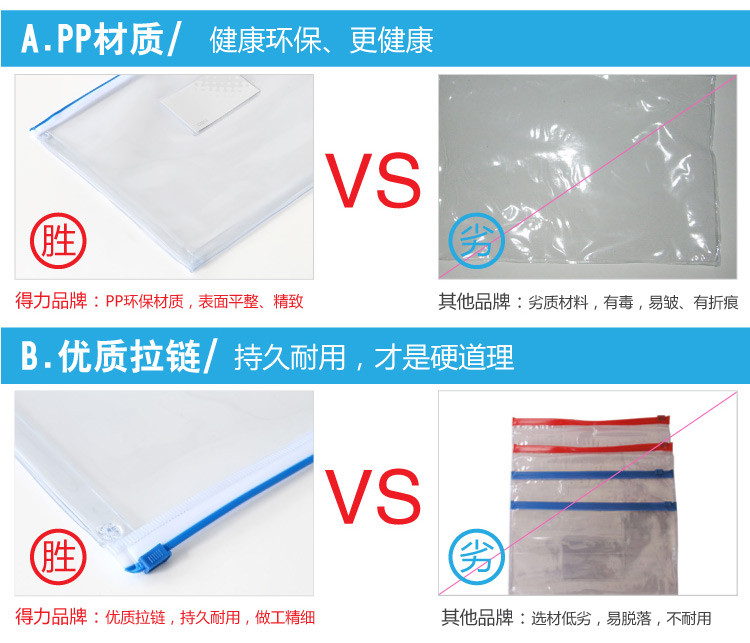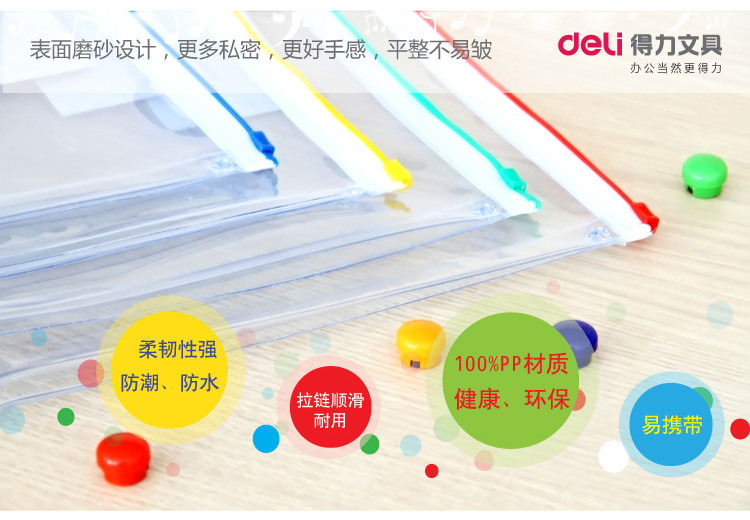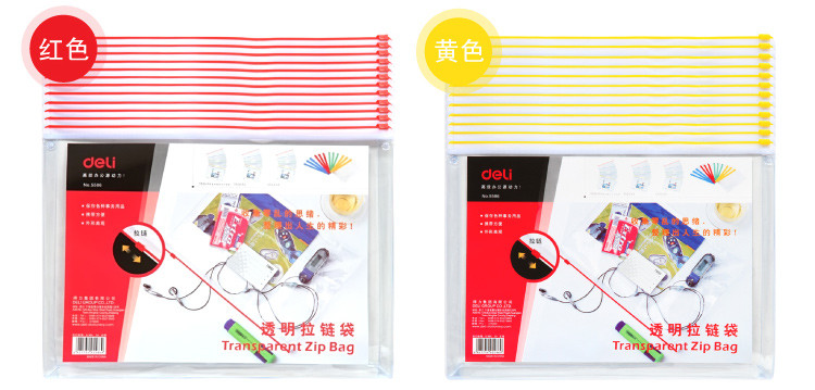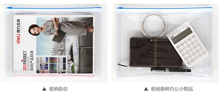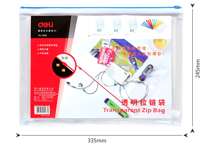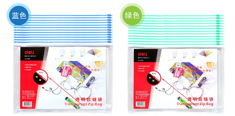 商品名称:得力5586 商品编号:030443 品牌:得力(deli) 上架时间:2012-07-16 17:30:58 商品毛重:70.00g 商品产地:中国大陆 类型:拉链袋 产品信息Product Information12个装/卖(保存各种事务用品,携带方便,外形美观)以100%进口PP环保材质代替传统的pvc材质,更健康环保,经防静电处理,不易脆不粘连,使用便利产品信息Product Information精工细作,细致到每一个细节,绝对的品质保证收纳各类票据、证件、卡片、零钱、笔记本等,用途广,办公、学习、家居、差旅均适用!得力品牌与其他品牌竞比产品在实际空间中的展示品牌荣誉Brand Awards