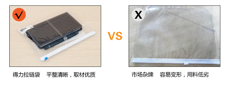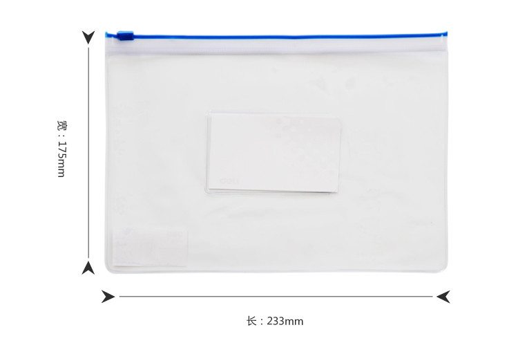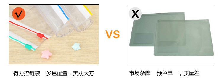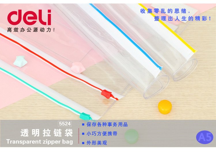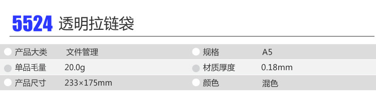 商品名称:得力5524 商品编号:030444 品牌:得力(deli) 上架时间:2012-01-06 13:07:29 商品毛重:20.00g 商品产地:中国大陆 类型:文件夹/文件袋 产品信息Product Information尺寸信息Size Information得力(DeLi)5524-A5透明拉链袋 尺寸:233×175mm 材质厚度:0.18mm产品展示Products Exhibition得力(DeLi)5524-A5透明拉链袋有红,黄,绿,蓝四种颜色红,黄,绿,蓝四种颜色配置,清晰靓丽,美观大方产品功能Product Function可储存资料,笔记本,CD,笔,尺子等各类物件附带名片储存袋,方便识别,不易丢失,小设计大用处产品特色Selling Point