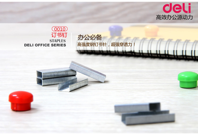 温馨提示Kindly Remind得力(Deli)0010通用订书钉推荐搭配:得力0366-省力型订书机超强装订组合,办公更得力使用小贴士当订书机中的订书针使用至最后几枚时,可能会出现卡钉,此为正常现象,请及时补充订书钉