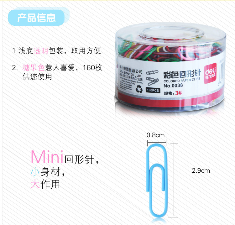 得力(DELI)0038 29MM彩色回形针 160枚/筒 ¥3.80/筒