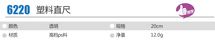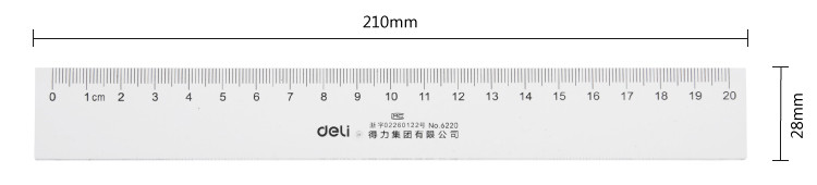 商品名称:得力20cm塑料直尺6220 商品编号:030591 品牌:得力(deli) 上架时间:2011-04-20 17:05:50 商品毛重:10.00g 商品产地:中国大陆 类型:桌面文具 产品信息Product Information尺寸信息Size Information得力6220塑料直尺的规格为20cm,尺寸为210×28×2mm产品细节Product Details得力6220塑料直尺的规格为20cm,最大可量取20cm尺寸的产品,得力尺子采用高档ps料,超透明品牌介绍Brand Introduction得力致力于为全球消费者提供性价比最优的产品,使办公学习成为乐趣。得力文具借助强大的研发与制造能力,形成了基本覆盖日常办公和学习所需的产品群,率先完成综合文具供应商角色定位。得力让办公变得更高效,是你值得信赖的助手,你的成功就是“得力”的价值所在。得力文具,就在你身边,让世界上每个办公室都拥有 “得力”。