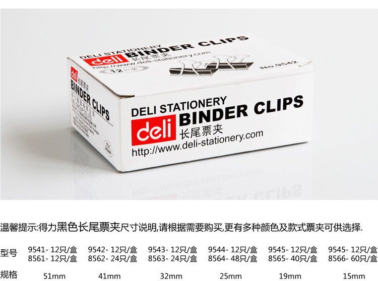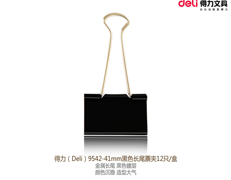 得力(Deli)9542-41mm黑色长尾票夹12只/盒 包装形象
