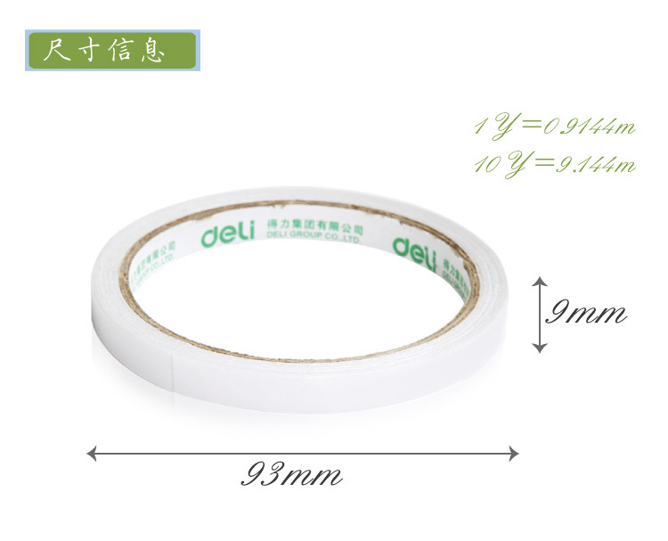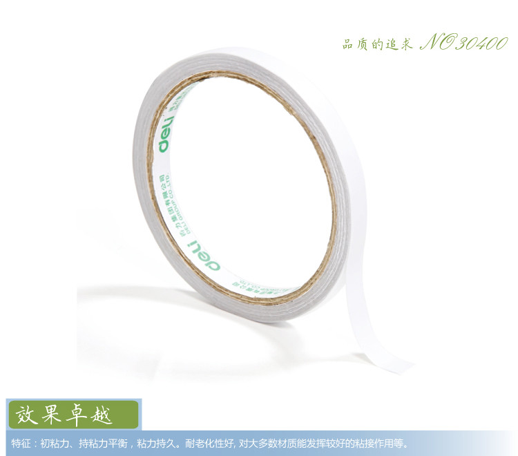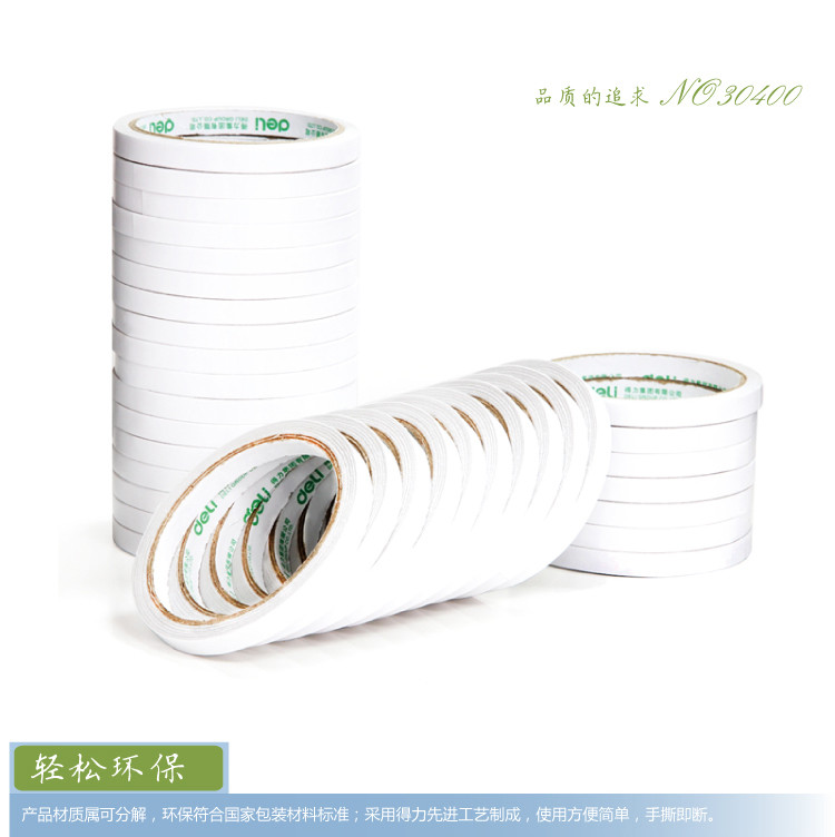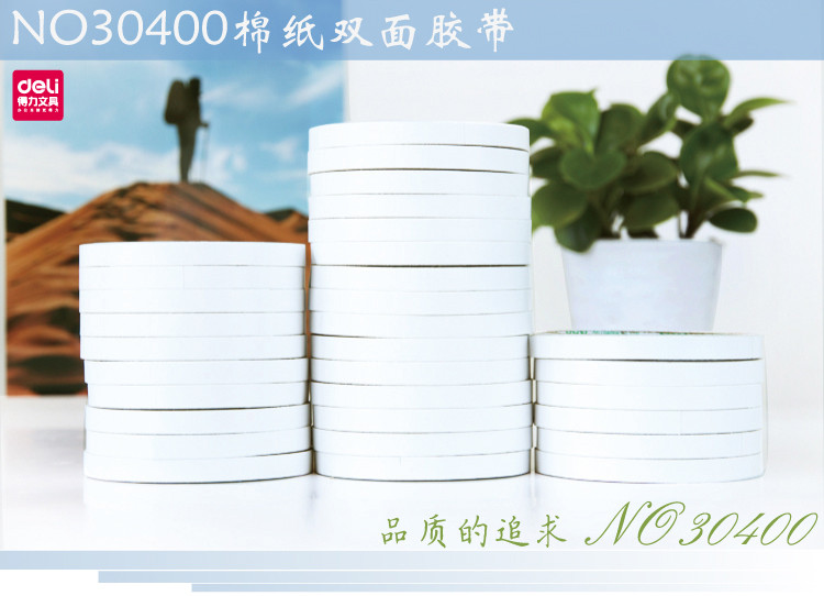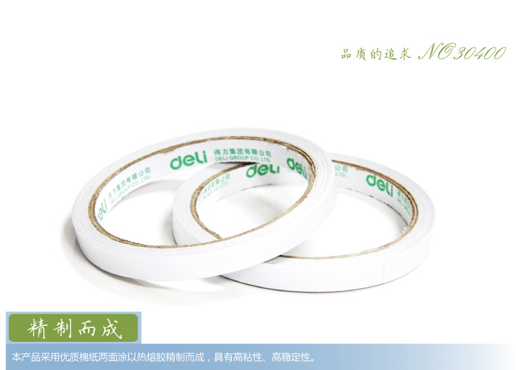 商品名称:得力30400棉纸双面胶带 商品编号:030699 品牌:得力(deli) 上架时间:2011-04-29 17:21:07 商品毛重:0.6kg 商品产地:中国大陆 类型:胶带及附件 产品信息Product InformationNO.30400棉纸双面胶带,生活小助手,办公更轻松。热熔棉纸双面胶:NO.30400,宽9mm,胶带总长为10y,一层胶纸厚度为80um。产品特色Selling Point可用于办公和家居轻量物品的贴合和粘固。适用于胶袋封口,墙报及纸张等的粘贴,固定和贴合。轻松掌控办公和生活,就要给自己轻松的选择,轻松环保才能愉快生活。实景展示Virtual show