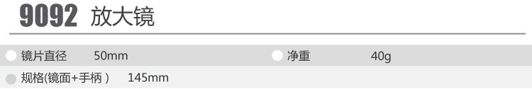商品名称:得力9092 商品编号:030718 品牌:得力(deli) 上架时间:2011-04-20 17:17:23 商品毛重:50.00g 商品产地:中国大陆 类型:其它 产品信息Product Information网球拍造型设计,时尚大方尺寸信息Size Information玻璃镜片,主体外框材料采用ABS材料,镜片采用专业人工打磨技术,呈像更清晰产品特色Selling Point实际放大效果展示图(可用于野外考察、办公、家庭使用,携带方便)产品展示Products Exhibition产品展示实景展示Virtual show产品实拍温馨提示Kindly Remind温馨提示:1.有些人认为倍数越高越好,其实是错误的,倍数越高,镜片越厚,直径越小,看起来越费力。2.高倍放大镜一次只能看一个字甚至只能看半个字或者一个字的一个笔画,而且字的边角严重变形,根本不适合看书,高倍的放大镜适合观察邮票的印刷点排列、瓷器的裂纹玉器的纹路等。品牌介绍Brand Introduction得力致力于为全球消费者提供性价比最优的产品,使办公学习成为乐趣。得力文具借助强大的研发与制造能力,形成了基本覆盖日常办公和学习所需的产品群,率先完成综合文具供应商角色定位。得力让办公变得更高效,是你值得信赖的助手,你的成功就是“得力”的价值所在。得力文具,就在你身边,让世界上每个办公室都拥有 “得力”。