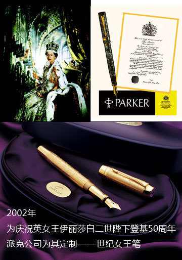 英国人向来以挑剔和注重品位著称,他们推崇高品质的绅士生活,而英国皇室更是将这种追求完美品质的精神发挥到了极致。英国皇室为定义商品品质而推行的认证制度——皇室御用委任状(Royal Warrant)。 “皇室御用委任状”是英国王室向有关公司或人士颁发的证书,以此表明他们对其商品和服务感到满意。能够得到英国皇室授权,成为皇室御用物品的品牌,无一不是历经时间考验脱颖而出的,服装有Burberry,座驾有宾利,瓷器有德贝瓷,钢笔则有派克笔。 早在1962年,派克就被指定为英国皇室笔和墨水供应商。2002年,为庆祝英女王伊丽莎白二世陛下登基50周年,派克世纪女王笔应运而生,全球限量发行2500支。这支笔的笔帽与笔身均由23k纯金打造而成,并镌刻有继位宣言的节选,笔顶还有五十周年庆典的官方标志。