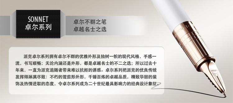 派克笔的创始人--乔治派克(George S.Parker)于1888年创立了派克笔公司,以“拔萃之作,智者之选”的理念致力于制造“更好的笔”。著名作曲家普西尼、小说家柯南道尔都使用派克笔,创作出传世佳作。自1962年以来,派克笔公司一直是英国王室书写工具及墨水的唯一供应商。派克笔还多次作为重要条约的签署用笔而见证历史。百年辉煌历史,铸就派克卓越品质。 派克笔在自来水笔历史上曾创造了多项世界第一。乔治.派克认为,只有“使产品更臻完善,人们才会购买”。这个经营哲学一直指导着派克公司致力于制造“更好的笔”。这亦即是历经百年沉积在派克笔中的深厚的文化内涵。 派克笔工艺超卓,派克笔性能优越,工艺精湛,持久耐用,设计新颖,物超所值,令使用者在书写时感受到无穷的乐趣。派克笔为文具产业带来了一场革命,派克的每一步成功都离不开多年的艰苦研究和不断推陈出新的远见卓识,这就是派克成为书写行业领导者的关键。时至今日,派克笔已被视为最完美的钢笔之一。