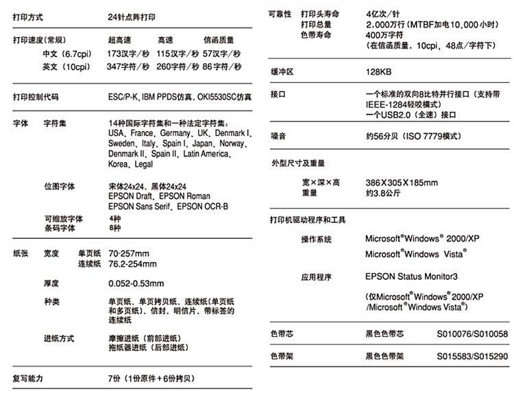 平均无故障时间1万小时;全新打印头技术,令打印头寿命更长久,可承受4亿次击打,并且更耐热,过热保护时间也更长,连续工作再长的时间也能从容无忧!   全新打印头技术,令打印速度极速提升;中文173字/秒,英文347字符/秒,效率提高、事半功倍;内置128KB缓冲区,有效提高处理效率,海量打印也能迅速搞定!