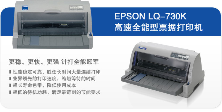 更节能--待机功耗仅为2.3W,仅为国家标准的1/7,长时间海量打印也不怕!Epson LQ-730K将成为企事业首选的节能打印产品。