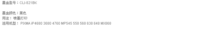 > 办公耗材 > 打印耗材 > 喷墨打印机/传真机墨盒 > 佳能(Canon)CLI-821BK 黑色墨盒(适用于PIXMA iP4680 3680 4760 MP545 558 568 638 648 MX868)