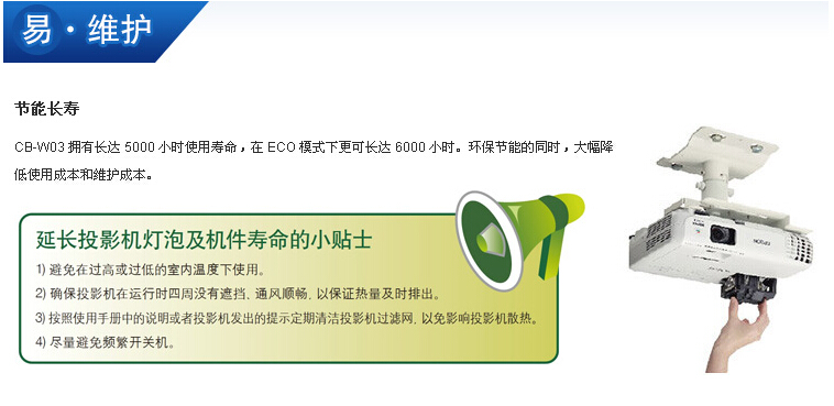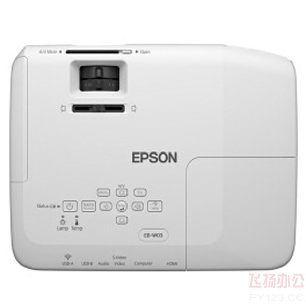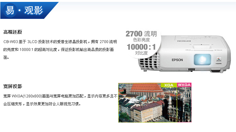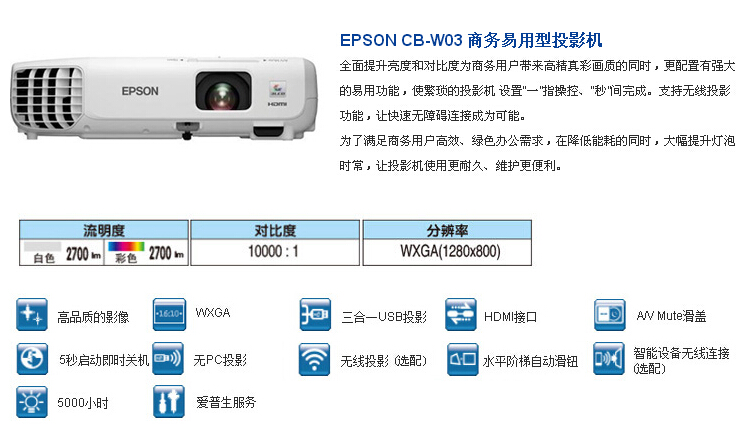 主体 品牌 爱普生 Epson 型号 CB-W03 颜色 白色 类型 商用投影机 发光原理 3LCD 光学规格 标称亮度(ISO流明) 2700 流明 标准分辨率 WXGA(1280*800) 对比度 10000:1 像素 1024,000 dots (1280x800) x 3 投影规格 投影镜头 类型:手动光学变焦 / 手动聚集