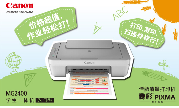 商品名称:佳能 MG2400 商品编号:040824 品牌:佳能(Canon) 上架时间:2014-02-28 11:24:50 商品毛重:3.5kg 商品产地:中国大陆 自动双面打印:打印/复印/扫描 网络打印:不支持 幅面:A4 用途:家用照片,居家办公 办公类型:彩色喷墨,黑白喷墨