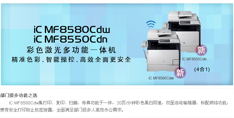 商品名称:佳能iC MF8580Cdw 商品编号:040857 品牌:佳能(Canon) 上架时间:2014-02-28 11:24:50 商品毛重:15.42kg 商品产地:中国大陆 多功能:打印/复印/扫描/传真,自动双面 网络打印:无线网络打印,有线网络打印,有线/无线网络打印,移动APP打印 幅面:A4 用途:工作组,部门级 办公类型:彩色激光