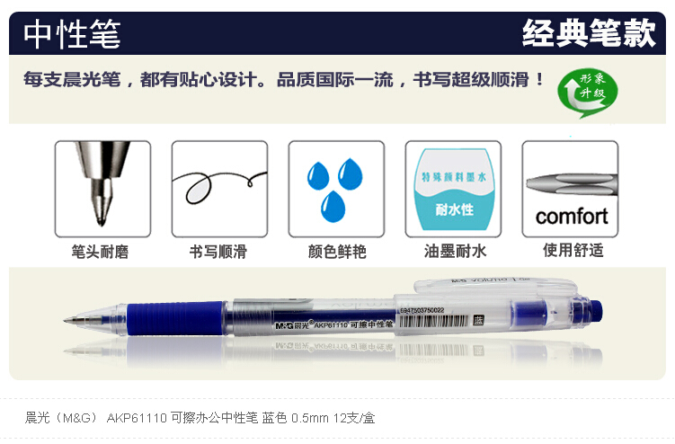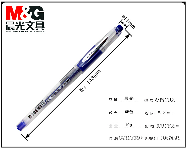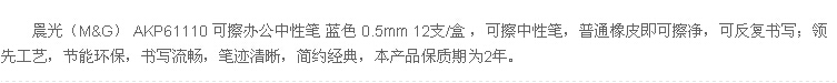 商品名称:晨光AKP61110 商品编号:033049 品牌: 晨光(M&G) 上架时间:2014-05-23 16:57:26 商品毛重:140.00g 商品产地:中国大陆 类别:中性笔/签字笔