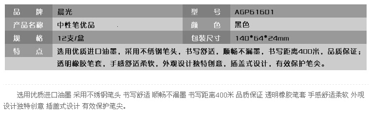 品牌: 晨光(M&G) 上架时间:2014-05-23 16:57:26 商品毛重:124.00g 商品产地:中国大陆 类别:中性笔/签字笔
