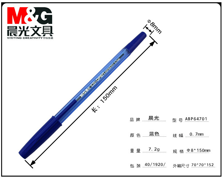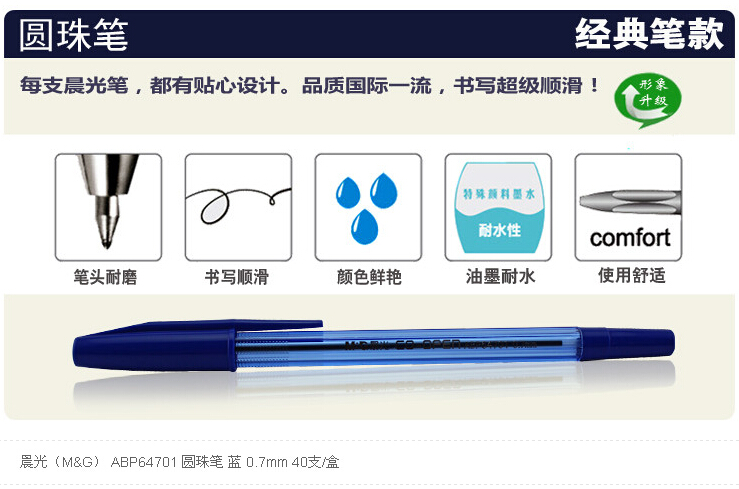 品牌: 晨光(M&G) 上架时间:2014-05-23 16:57:26 商品毛重:320.00g 商品产地:中国大陆 类别:圆珠笔