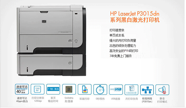 商品名称:惠普(HP) LaserJet Enterprise P3015 商品编号:040924 品牌: 惠普(HP) 上架时间:2015-02-04 14:09:02 商品毛重:20.07kg 商品产地:中国 网络打印:不支持 类型:黑白激光 幅面:A4 自动双面打印:支持 用途:部门级
