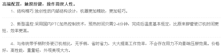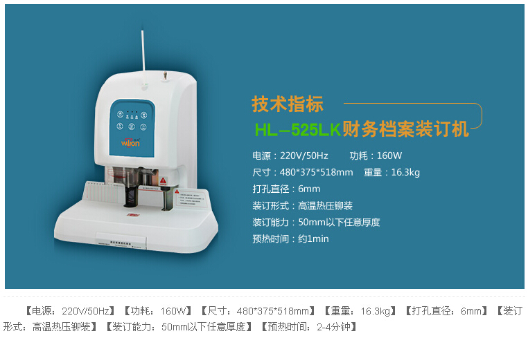 商品名称:惠朗HL-525LK 商品编号:041021 品牌: 惠朗(huilang) 上架时间:2013-03-19 09:13:55 商品毛重:18.49kg 商品产地:中国大陆 类别:财务装订机,热熔装订机,装订耗材,封装耗材 装订厚度:0—30mm,31—50mm 重量:10-20kg 装订方式:手动装订,半自动装订