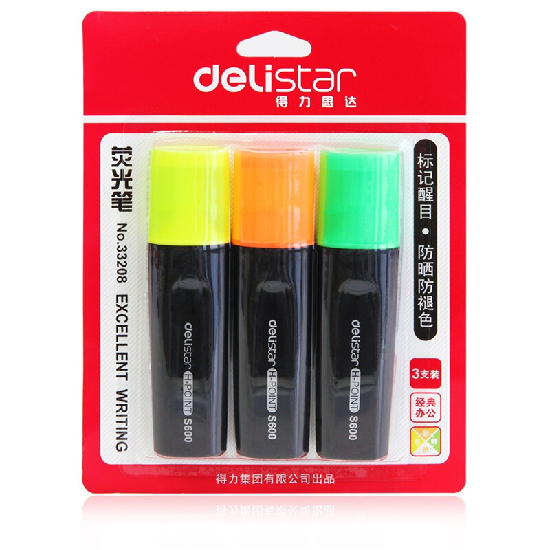 商品名称:得力33208 商品编号:170708 商品毛重:70.00g 商品产地:中国大陆 类别:荧光笔 数量:组合装 产品信息 Product Information【产品规格:5mm】【产品包装:三支装/卡】【产品净重:50g】【货号:33208】【产品尺寸:105*25*15mm】【墨水材料:特殊颜料墨水】笔芯颜料墨水,色彩鲜艳、亮丽夺目,标记醒目,防晒防腿色;烧结笔头,让书写流畅。NO33208荧光笔,外观设计时尚、精美;扁式笔身握笔舒适,切合书写手势。产品包装 packing detail包装简洁安全,三支装,使用过程中避免笔头向上的方式进行书写,不使用时请盖紧笔帽以延长使用寿命。