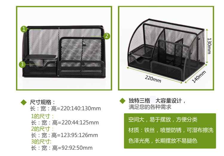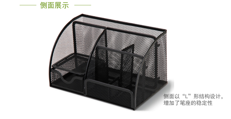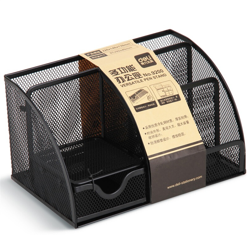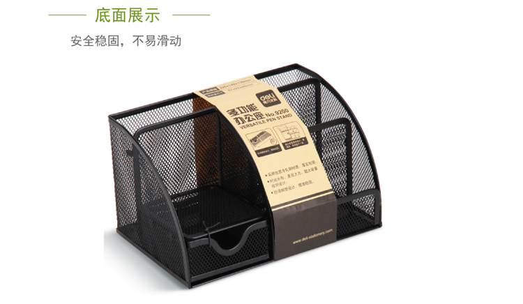 商品名称:得力9200 商品编号:170829 商品毛重:0.63kg 商品产地:中国大陆 类型:笔筒/收纳,其它 产品信息 Product Information在一堆办公用品中寻找东西是让人头疼的事,得力这款笔筒让您抛弃烦恼,为每个文具设计其独有的空间,为您提供舒适优雅的生活。这款产品采用冲孔工艺,外观大方;把常用的桌面办公文具结合在一起,使用方便、快捷,提高办公效率。产品展示 Products Exhibition做工精致,方便耐用产品细节 Product Details
