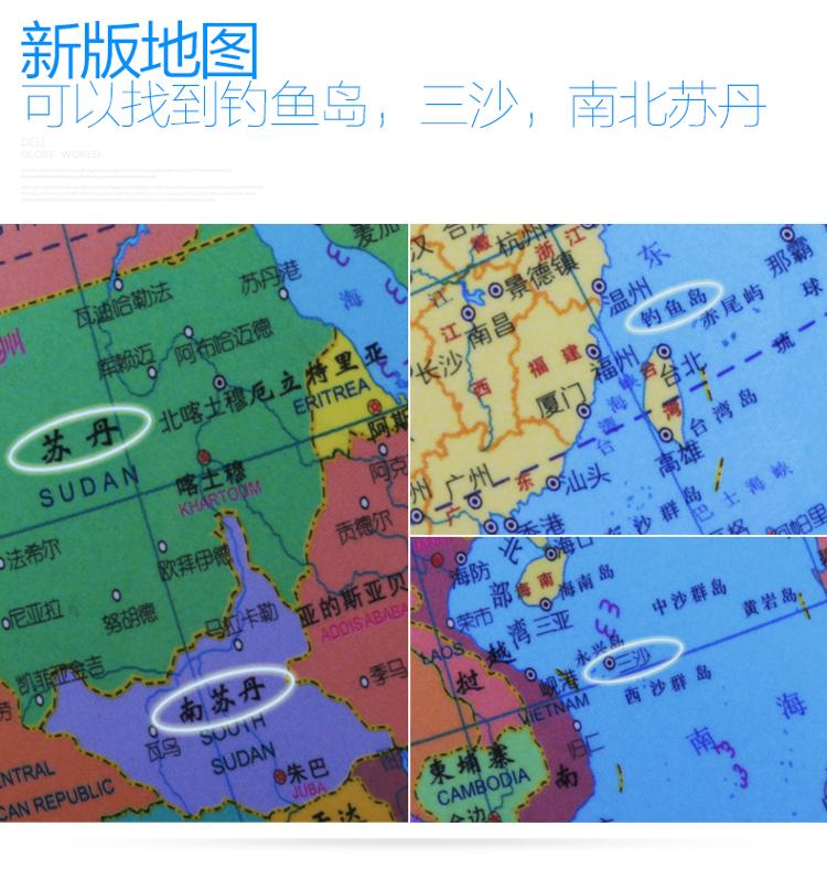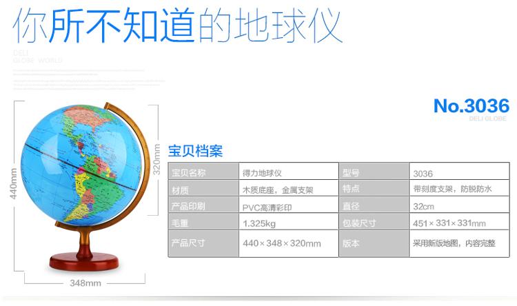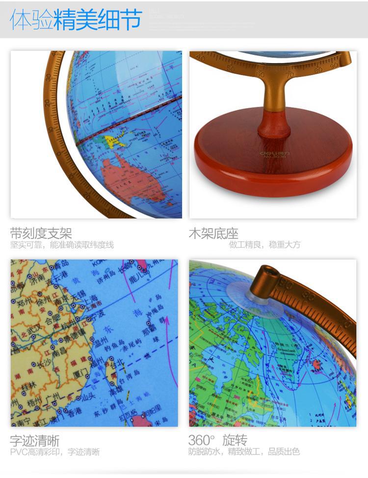 商品名称:得力3036 商品编号:171119 商品毛重:2.15kg 商品产地:中国大陆 类别:学生生活用品 产品展示 Products Exhibition产品信息 Product Information尺寸信息 Size Information产品细节 Product Details☆有助于立体地建立地理方位概念;理解地转偏向力的形成;演示地球的自转和公转,理解四季的变化和昼夜的更替;计算地方时和区时。☆认识地球家园的玩伴,学习地理知识的良师,学生教具礼品的上选。实景展示 Virtual show注意:新旧版本随机发送(新版:全中文地球仪、旧版:中英文对照地球仪)
