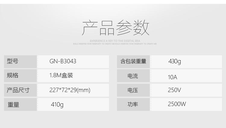 品牌: 公牛(BULL) ♥关注 --> 商品名称:公牛GN-B3043 商品编号:171312 商品毛重:430.00g 商品产地:中国大陆 全长:2米以下 更多参数>> 产品展示 Products Exhibition![]()