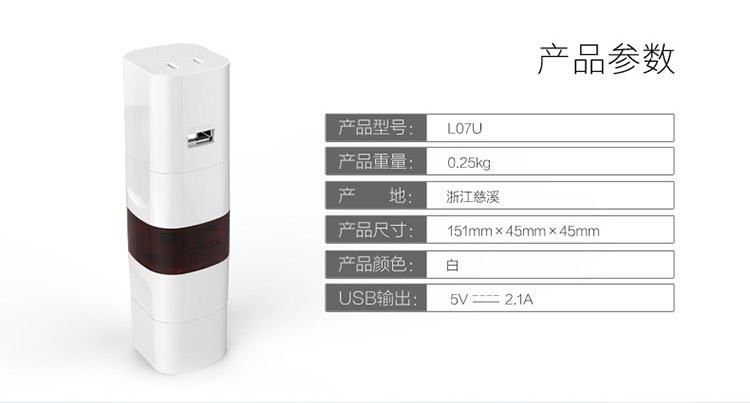 品牌: 公牛(BULL) 商品名称:公牛GN-L07U 商品编号:171331 商品毛重:230.00g 商品产地:中国大陆 孔位:孔位转换器 开关:无开关 适用标准:其他国外标准 全长:无线 功能:USB充电