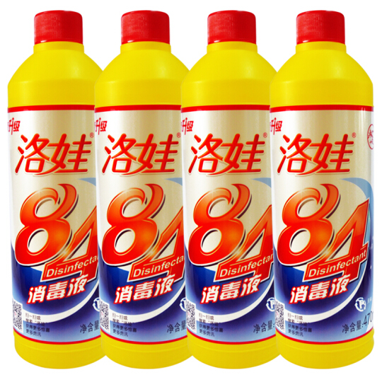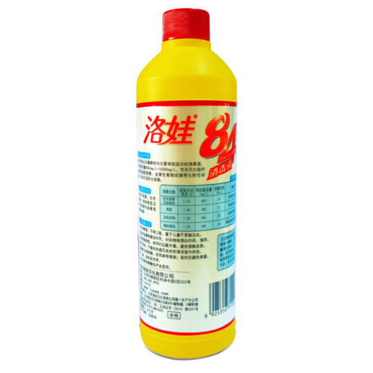 品牌: 洛娃 ♥关注 --> 商品名称:洛娃84消毒液 商品编号:180417 商品毛重:2.135kg 商品产地:中国大陆 适用范围:家用 分类:除臭消毒 产品产地:中国大陆 适用场景:卫浴,厨房,地面,家具 更多参数>> 洛娃 精选爆款推荐家居 公共场所消毒必备除菌*洗果蔬漂白去渍消毒液84可杀灭大肠杆菌等肠道致病菌、金黄色葡萄球菌等化脓性球菌,并能灭活肝炎病毒。经济适用洛娃 84消毒液470ml*4瓶产品参数Product Standards【产品规格】470ml×4瓶 【箱规】5套/箱