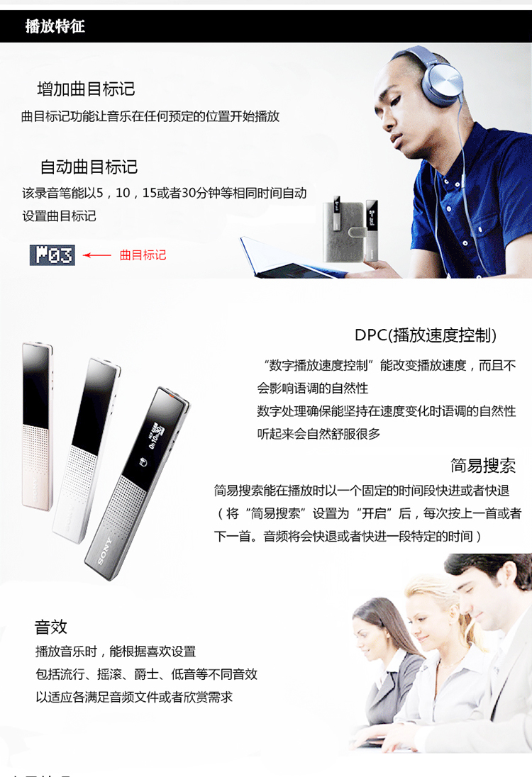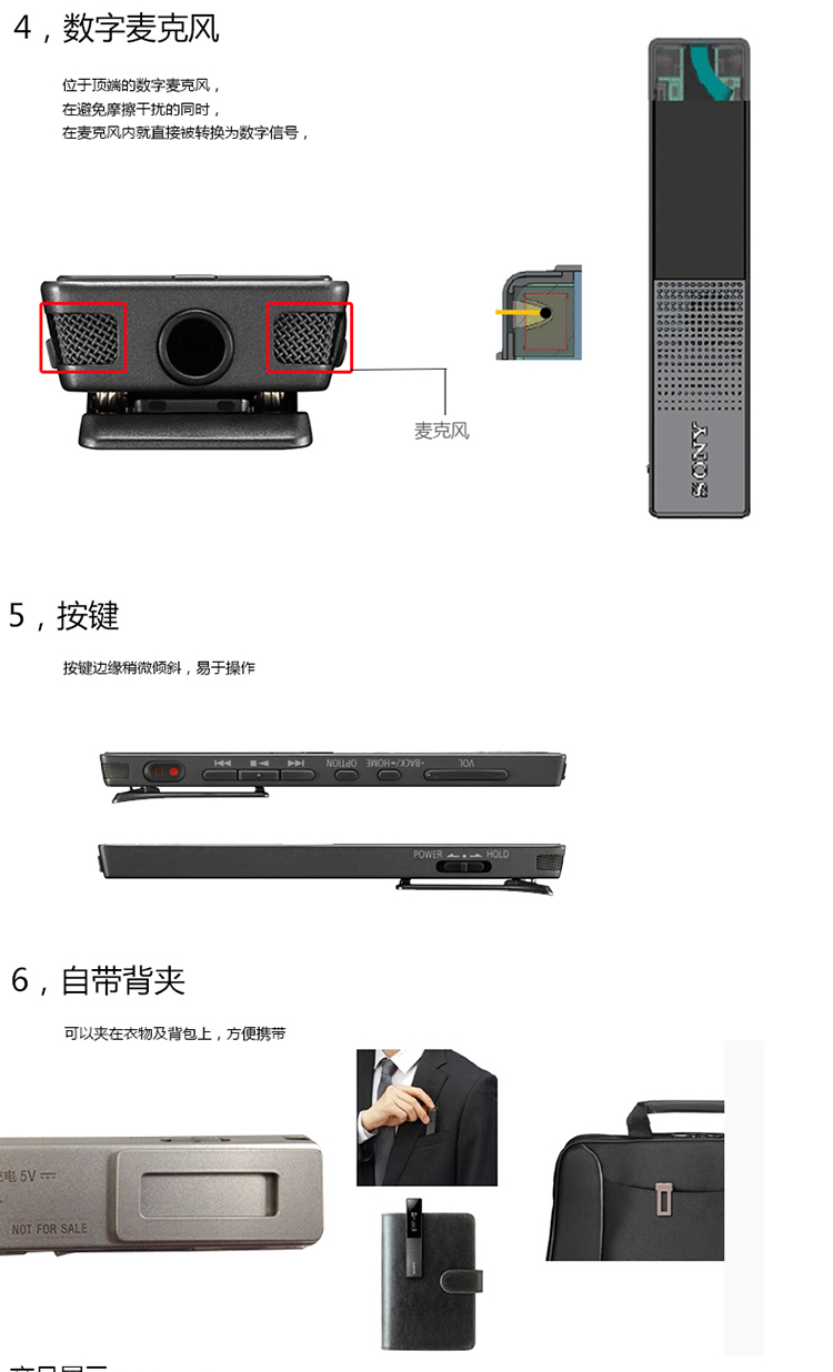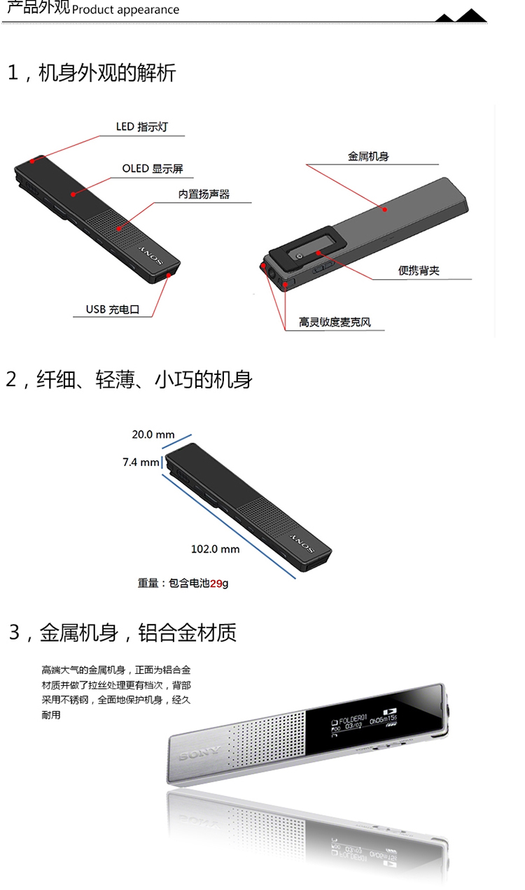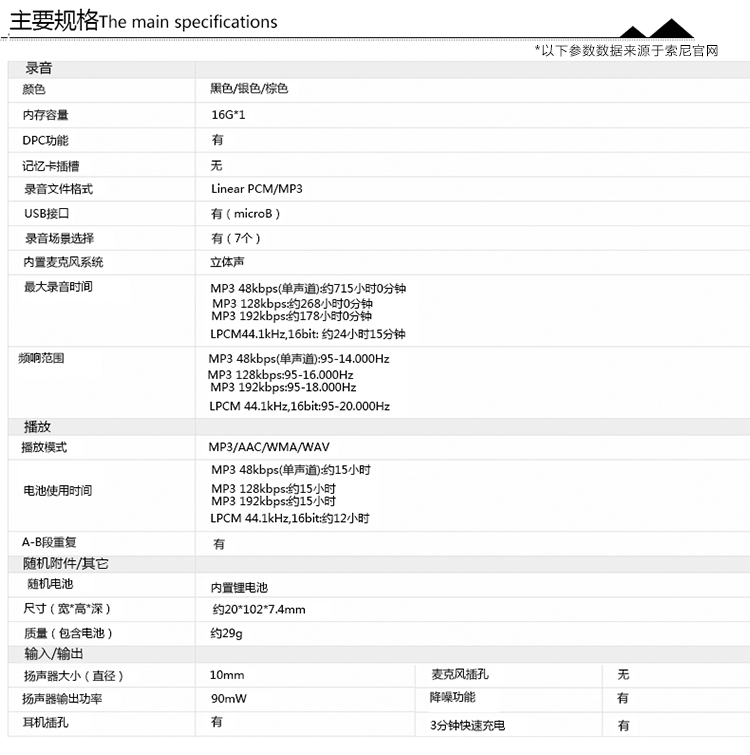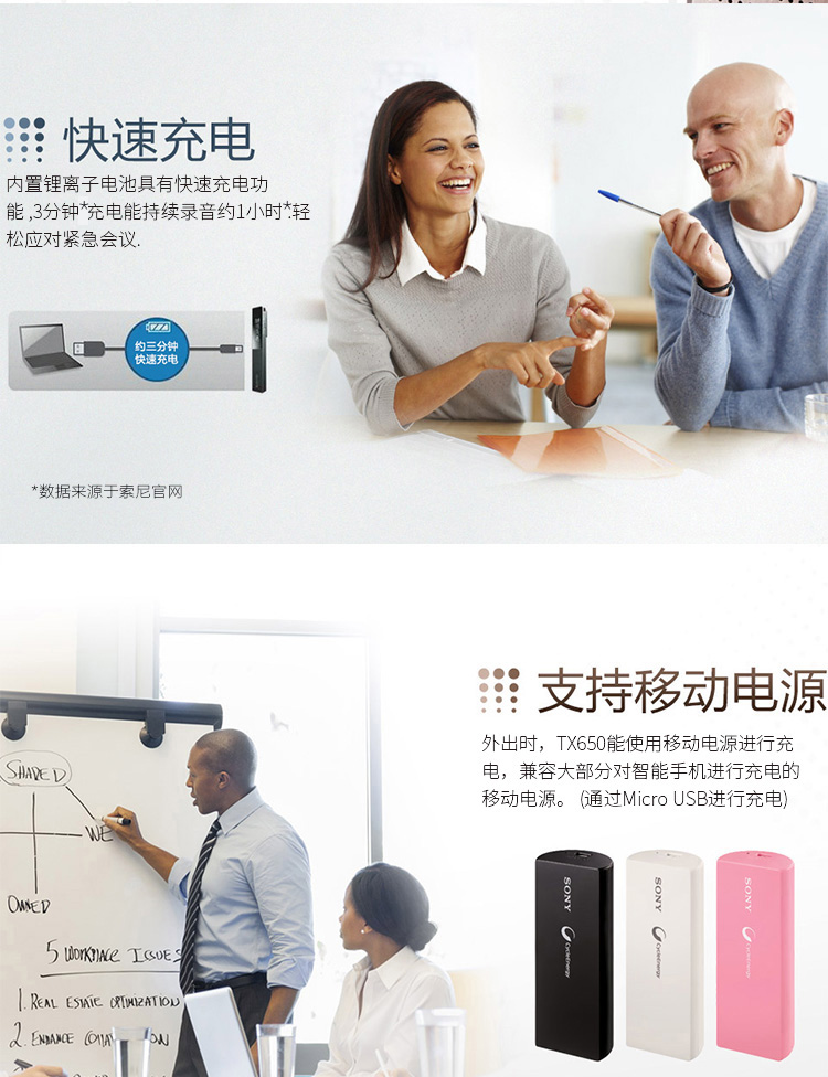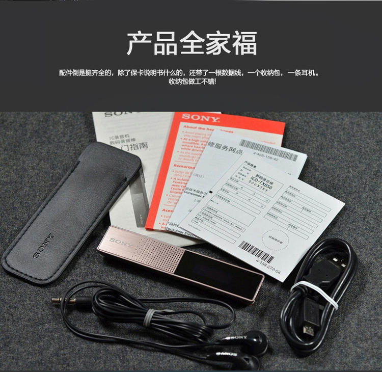 产品配件:SONY ICD-TX650主机(黑)*1、立体声耳机*1、USB数据线*1、便携套*1、说明书*1、保修卡*1 尺寸:102.0mm×20.0mm×7.4mm 重量:约29g 内存容量:16G(约14.40 GB=15461882265字节) 充电方式:USB数据线直充(充电三分钟,录音一小时) 电池规格:内置充电式锂离子电池3.7V 录音格式:Linear PCM/MP3 音频播放格式:MP3/AAC/WMA/WAV 录音时长:MP3 192kbps:约 178 小时 0 分钟 电池使用时间:LPCM 44.1kHz, 16bit:约12 小时 特殊功能:降噪功能、七种录音场景、立体式麦克风 (以上参数来源于索尼官网)