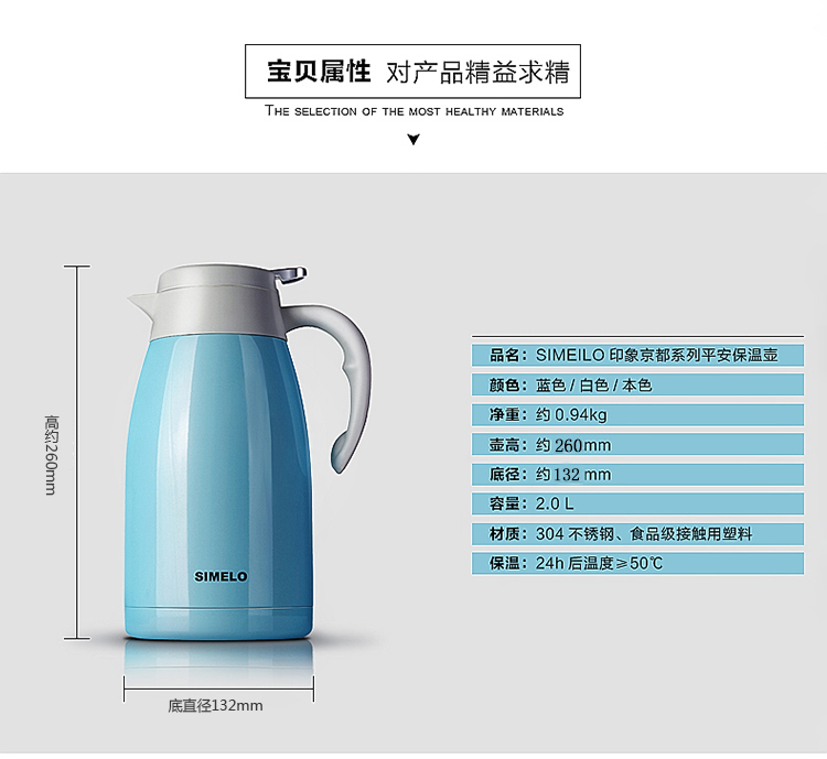 品牌: 施美乐SIMELO 商品名称:施美乐SIMELO保温壶 商品编号:180487 商品毛重:0.9kg 商品产地:浙江 材质:304不锈钢 容量:2L 适用场景:家用 分类:暖瓶/暖壶 功能:有手柄 保温时长:12.1小时-24小时